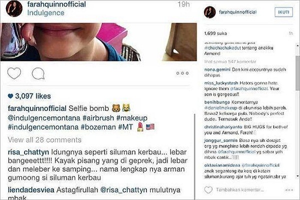 Warganet bernama @risa_chattyn menyebut bahwa hidung anak Farah Quinn ini lebar seperti siluman kerbau.