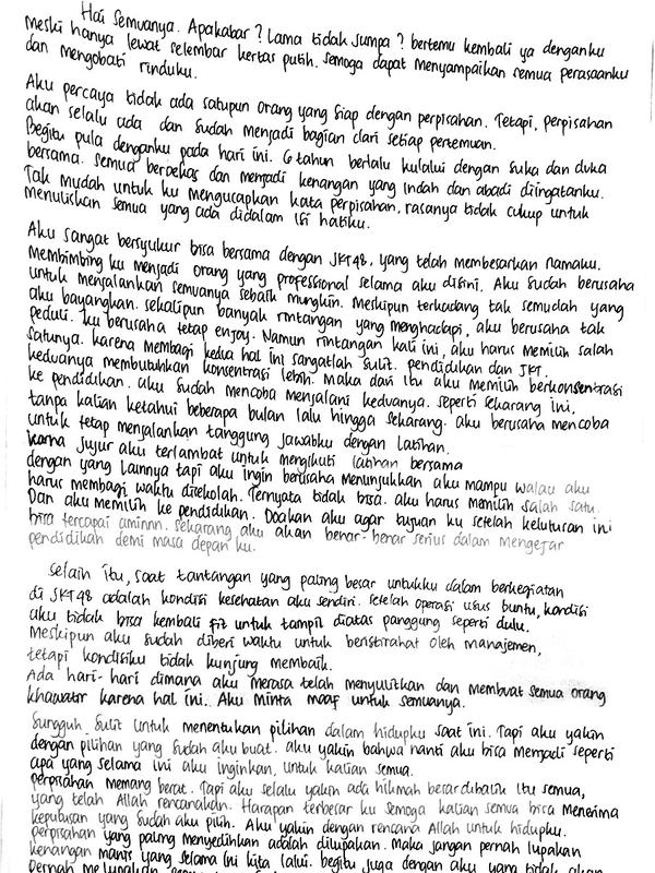 Tak hanya itu Nabilah Ratna Ayu juga menulis surat untuk para fans, surat tersebut difoto dan di unggah oleh tim manajemen JKT48. "Akhir kata, izinkan aku untuk melanjutkan perjalanan ini. Jalan yang aku pilih. Jalan yang membawa aku untuk menjadi sesuatu yang lebih baik lagi...," tulis Nabilah sebagai penutup surat.