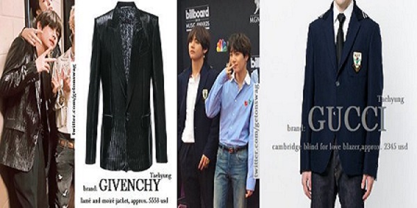 Member V: mengenakan jas dari Gucci yang berwarna navy. Jas tersebut seharga 2345 USD (sekitar Rp 33 juta). Sementara di comeback stage, vokalis BTS ini mengenakan jas hitam merek Givency seharga 5553 USD (sekitar Rp 78 juta).
