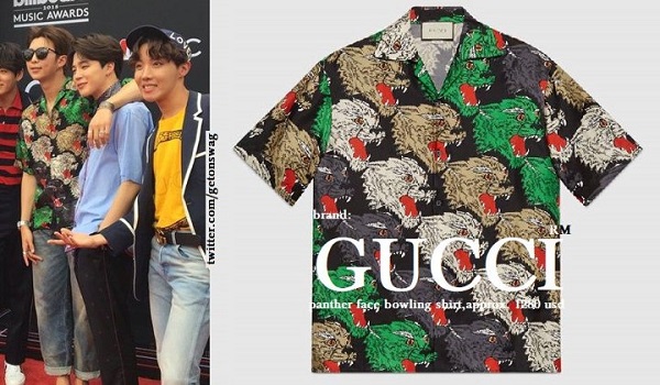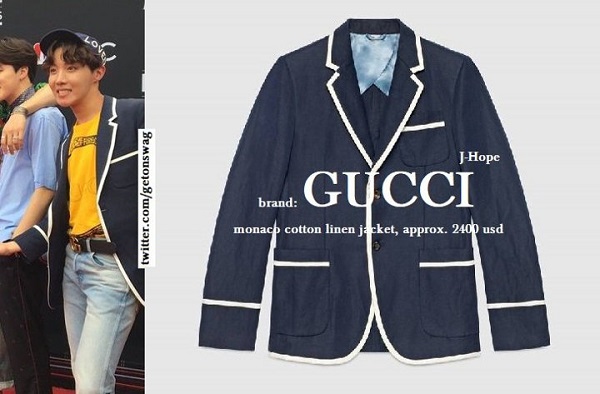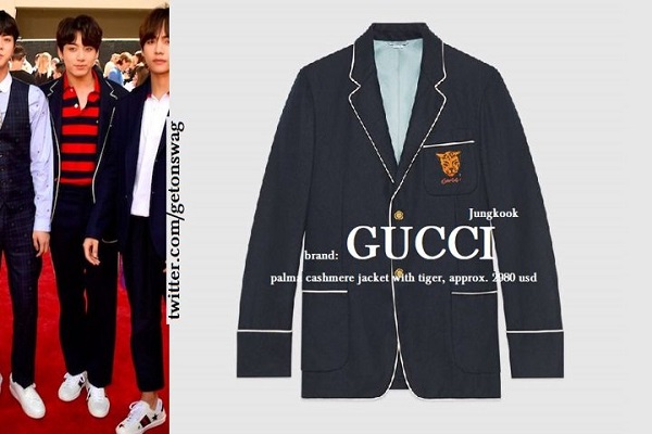 Jungkook: senada dengan V menggunakan merk yang sama, jas keluaran Gucci. Jas dengan logo harimau di saku kirinya itu bernilai 2980 USD (sekitar Rp 42 juta).