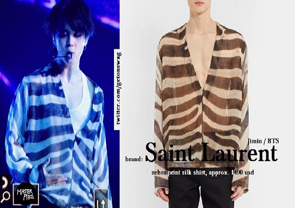 Jimin : koleksi dari Saint Laurent. Meski bermodel transparan, busana tersebut bernilai 1490 USD (sekitar Rp. 21 juta) lho. Harganya bikin geleng-geleng kepala .