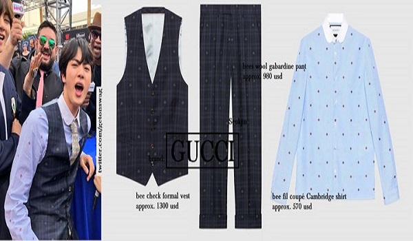 Jin tampak mengenakan setelan vest berwarna navy yang juga bermerek Gucci. Satu pasang setelan tersebut berharga 2280 USD (sekitar Rp 32 juta).