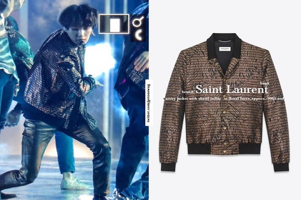 Suga : Sugamemakai jaket dengan motif floral lurex. Jaket keluaran merek ternama, Saint Laurent tersebut bernilai 2065 USD (sekitar Rp 29 juta).