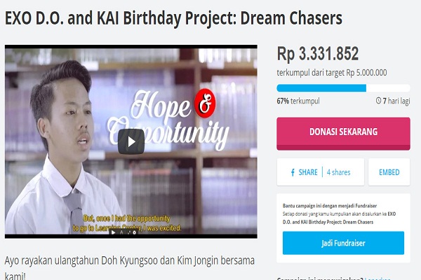 Lewat ulang tahun member EXO Kai dan D.O. ini juga para fans EXO atau yng biasa di sebut EXO- -L Indonesia ingin memberikan hadiah yang spesial untuk mereka.Dengan melakukan penggalangan dana untuk mendukung anak – anak Indonesia meraih mimpi mereka. Dan untuk dapat menimba ilmu dan maju lebih jauh dalam menggapai mimpi mereka tersebut.