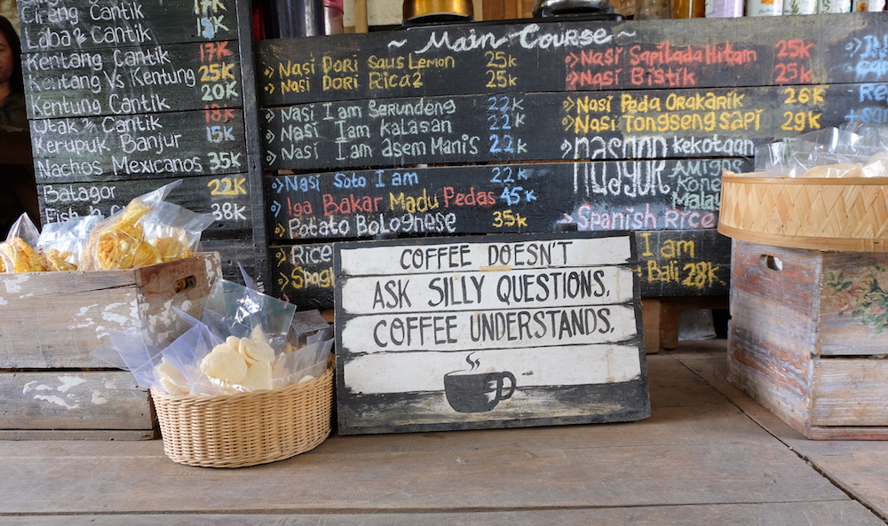Minuman yang ditawrkan tidak hanya Kopi saja tetapi ada juga Jeruk Nipis, Jahe Rempah, Lemon Tea dan yang cukup populer adalah Milo Tubruk. Makanannya cukup variatif, untuk snack Anda perlu coba Cireng Cantik dan Tahu Pedas juga Laba-Laba (alias bala-bala/bakwan goreng). Ada pula Singkong Keju yang kelihatannya jadi favorit di situ. Kalau ingin makan berat, ada beberapa macam pilihan nasi goreng dan soto. Untuk harganya tak perlu khawatir harganya untuk minuman coffee mulai dari Rp 10.000 dan untuk makanannya paling mahal Rp 45.000 .